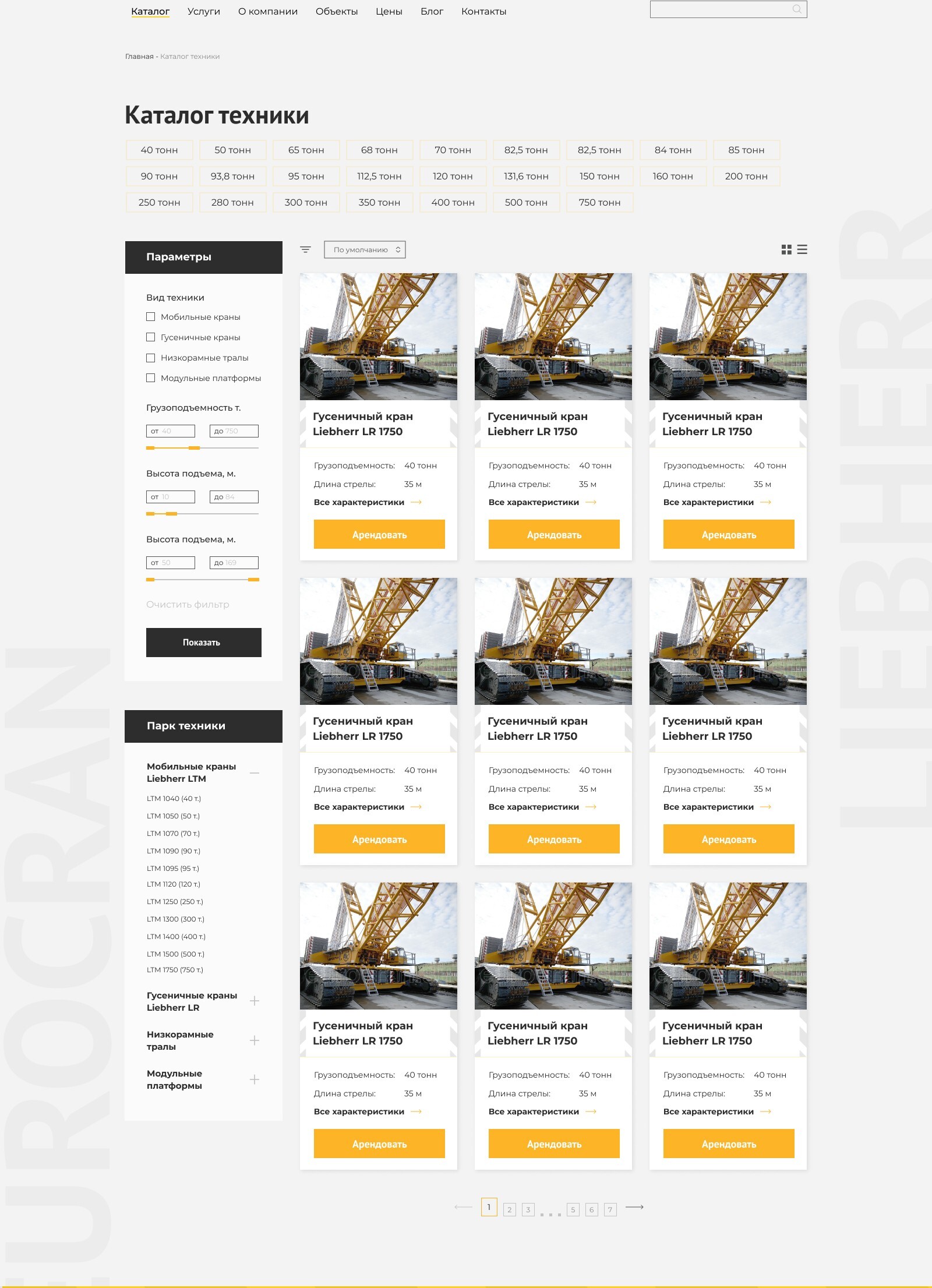 Разработан полноценный многостраничный каталог с категориями и фильтрами по подбору спецтехники. Выполнено описание, характеристика и каталоги для всех единиц техники.